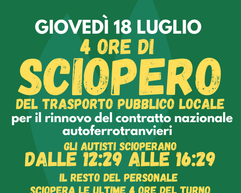 Parte giovedì 18 luglio la prima azione di sciopero dei lavoratori delle imprese che applicano il Contratto Nazionale degli Autoferrotranvieri. Lo sciopero nazionale, proclamato dalle Organizzazioni Sindacali di settore, Filt Cgil, Fit Cisl e Uiltrasporti Uil, Faisa Cisal e Ugl Fna, riguarderà nella provincia di Modena il personale di Seta, delle società private che operano in sub-concessione a Seta e delle altre società che applicano il Contratto Nazionale degli Autoferrotranvieri. Lo sciopero verrà svolto con l’astensione dal lavoro degli autisti dalle ore 12.29 alle 16.29 di giovedì 18 luglio prossimo (ai fini del rispetto delle fasce di garanzia previste dalle legge 146) e per il resto del personale nelle ultime 4 ore del turno.