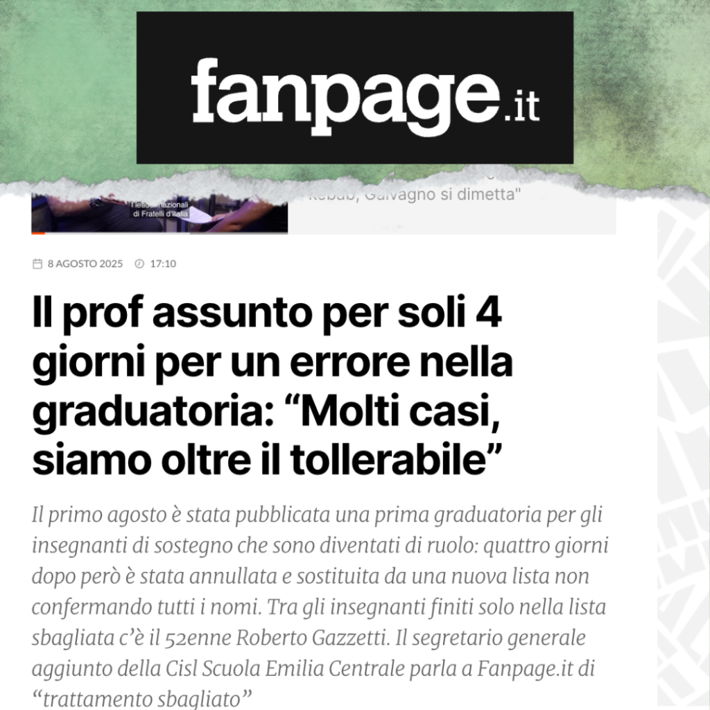 Il 5 agosto compare un ๐ฏ๐ผ๐น๐น๐ฒ๐๐๐ถ๐ป๐ผ ๐๐๐น ๐๐ถ๐๐ผ ๐ฑ๐ฒ๐น๐นโ๐จ๐ณ๐ณ๐ถ๐ฐ๐ถ๐ผ ๐๐ฐ๐ผ๐น๐ฎ๐๐๐ถ๐ฐ๐ผ ๐๐ฒ๐ฟ๐ฟ๐ถ๐๐ผ๐ฟ๐ถ๐ฎ๐น๐ฒ (il Provveditorato, come si chiamava una volta): ๐ฅ๐ผ๐ฏ๐ฒ๐ฟ๐๐ผ ๐ฟ๐ฒ๐๐๐ฒ๐ฟ๐ฎฬ ๐ฝ๐ฟ๐ฒ๐ฐ๐ฎ๐ฟ๐ถ๐ผ, il suo contratto a tempo indeterminato รจ incenerito allโistante. Il sogno di Roberto era stato prodotto da โun errore di sistemaโ, spiega il bollettino.